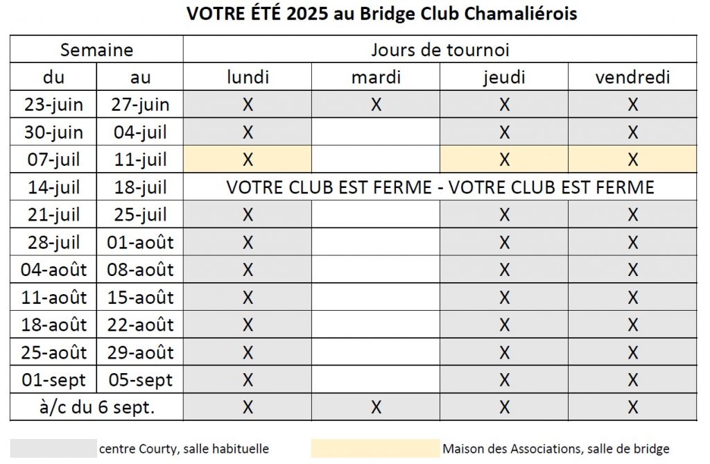 – le vendredi 30 mai (salle réservée pour une autre activité que le bridge) et